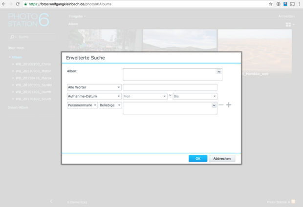 Ein Tipp: Auf dem PC/MAC kann man im Browser eine Erweiterte Suche im Fotoserver aufrufen, wenn man im Suchfeld auf das kleine Dreieck neben der Lupe klickt. Dort kann man dann z.B. aus einer Auswahl von Personen wählen, für die man sich Fotos anzeigen lassen möchte. Es sind aber auch Orte und teilweise Motive getaggt, die sich suchen lassen. Auch lässt sich über das Datum suchen.