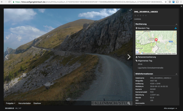 Ein weiterer Hinweis: Viele der Fotos, vor allem die seit ca. 2013 sind mit Geo-Tags versehen. Das heisst, man kann sehen, wo diese Fotos aufgenommen wurden. Dazu muss man in der Einzelansicht der Fotos auf das Icon rechts neben "Standort-Tag" klicken, dann bekommt man eine kleine Karte eingeblendet, in die man hinein- oder herauszoomen kann.