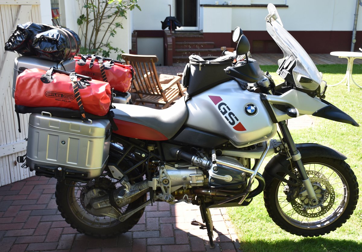 Auf dem Motorrad sind zusätzlich zu den Koffern und dem Tankrucksack unsere beiden Schlafsäcke auf dem Topcase und zwei Taschen mit unseren Klamotten (Tasche Brigitte, Tasche Wolle) jeweils auf den Seitenkoffern anzubringen.